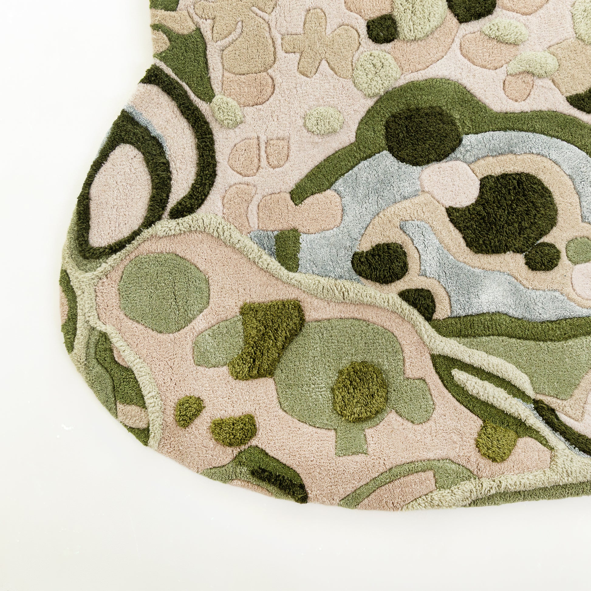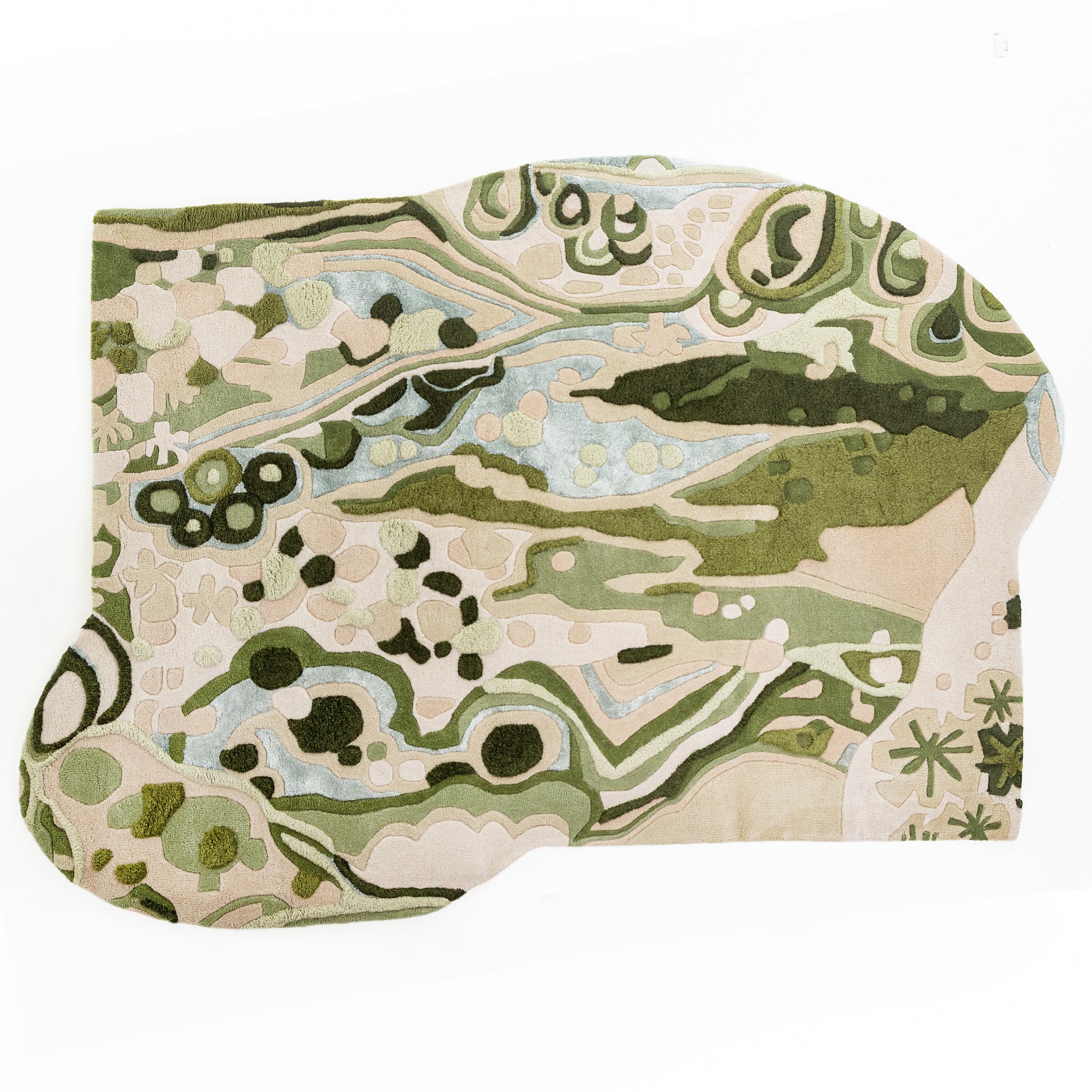 Inspired by algae formations and swamp flora, this irregular rug mirrors the richness of marshlands. Shades of green and beige flow like water and land interwoven. A lush ecosystem in abstract form, it brings organic calm into any space.